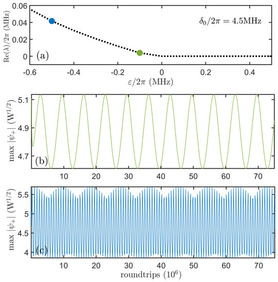 - Johansson, M.; Lobanov, V.E.; Skryabin, D.V. Stability analysis of numerically exact time-periodic breathers in the Lugiato-Lefever equation: Discrete vs continuum. Phys. Rev. Res. 2019, 1, 033196. [Google Scholar] [CrossRef] [Green Version]