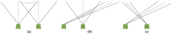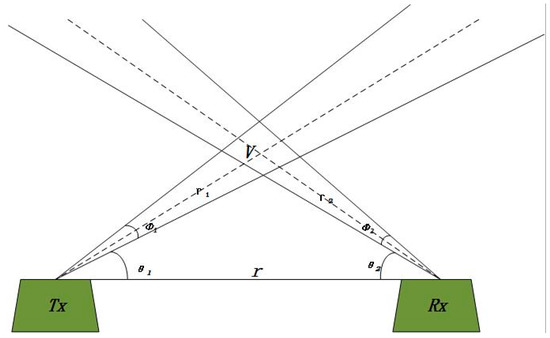Figure 1 represents the schematic diagram of the UV scattering channel. The UV source at the transmitting end (TX) transmits a light signal into space at a beam divergence angle (Φ1) and a transmitting elevation angle (θ1), and the receiver (RX) receives the signal at the field of view (FOV) angle (Φ2) and the receiving elevation angle (θ2). The transmitting beam and the receiving FOV form an effective scatterer (V) in the overlapping area in the atmosphere. The emitted UV signal reaches the RX after being scattered by V. Thus, the NLOS transmission of the signal is completed. According to the transceiver elevation angles, UV communication can be divided into three work patterns, as shown in Figure 2: NLOS-a, NLOS-b and NLOS-c.