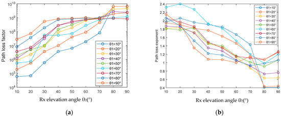 where L is the power attenuation, is the path loss factor, α is the path loss exponent and r is the communication radius. On the basis of Chen, we came to similar experimental conclusions after many Monte Carlo simulation experiments when Φ1 and Φ2 are fixed at 17° and 30°, respectively. Figure 3 shows the experimental results under the conditions of different transmit and receive elevation angles and a step length of 10°.