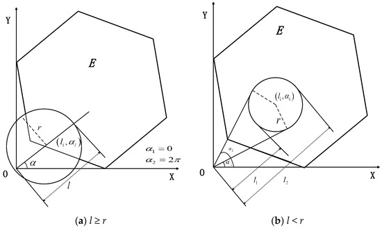 α1 and α2, l1 and l2 represent the upper and lower bounds of the integral area in the polar coordinate system, respectively. When l < r, as in Figure 5b, the pole O is within the coverage of the node ,