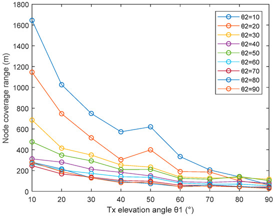Figure 6 shows how the node coverage range changes with the transmitting elevation angle (θ1) under different receiving elevation angles (θ2). We observe that as θ1 increases, the range gradually decreases. By contrast, we note that when θ1 is 50°, the coverage range is greater than that when θ1 is 40°. Since the volume of the effective scatterer (V) becomes larger as θ1 increases from 40° to 50°.