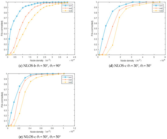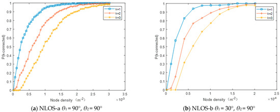 If the UV network needs to reach 2-connectivity, that is, the network connection rate reaches more than 95%, the node density under NLOS-a working mode is at least 1.71 × 10−3 m−2. The node density under NLOS-b (θ1 is chosen to be 50° and θ2 is unchanged) is at least 2.19 × 10−4 m−2, which is 12.8% of NLOS-a mode.