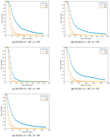 Figure 8 shows the changing trend of P(k-connected) with the data rate in different working modes ( = 5.0 × 10−4 m−2, Pt = 0.5 W). We know that the k-connection probability decreases with the increase of the data rate from Figure 8. When the working mode is NLOS-c, the data rate of the network from 1-connected state to 2-connected state needs to be reduced by 26%, and the data rate needs to be reduced by 39.4% to reach a 3-connected state, as shown in Figure 8e.