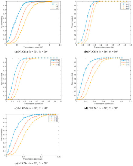 From Figure 9, the changing trend of P(k-connected) with the transmission power ( = 5.0 × 10−4 m−2, Rb = 10 kbps) can be found. That is, the P(k-connected) increases as the transmission power increases. When the working mode is NLOS-c, the transmission power of the network from 1-connected state to 2-connected state needs to increase by 27.0%, and the transmission power needs to increase by 53.7% to reach a 3-connected state, as shown in Figure 9e. By comparing Figure 7, Figure 8 and Figure 9, we notice that the smaller the transceiver elevation angles are, the better the network connectivity performance is.