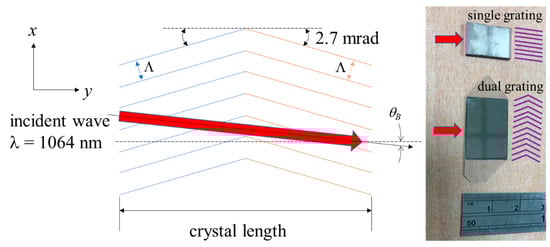 Schematic design of the dual-grating structure. The incident wave containing multiple spatial components has a wavelength of 1064 nm and propagates toward the y-direction. The two PPLN grating vectors form ±2.7-mrad angles with respect to the y-axis. The PPLN grating period Λ is 20.25 μm. The Bragg angle θB is 0.69° (12 mrad). Notice that the angle of the grating vector is exaggeratedly shown in this figure. The right picture shows the single-grating and the dual-grating samples used in the experiment.