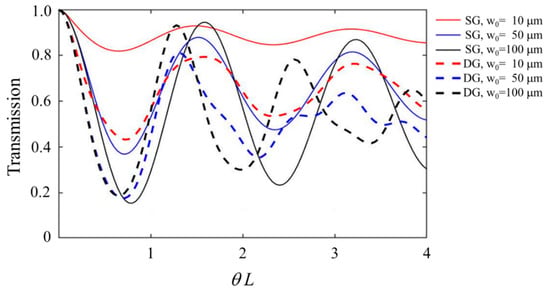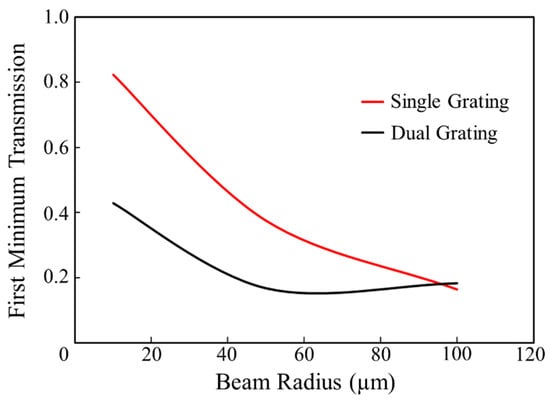 Figure 3 shows the first minimum transmission of the transmission curves versus incident beam radius for the single-grating and the dual-grating configurations for θL < 1. Notice that the first minimum transmission occurs at different θL as shown in Figure 2. When the beam radius is 100 μm, the transmission of the single- and the dual-grating configurations are 16.46% and 18.30%, respectively, when proper coupling strength is applied. Under this focusing condition, the beam radius does not cause significant reduction in deflection efficiencies for the two configurations. However, as the beam radius decreases, the first minimum transmission gradually increases. The first minimum transmission of the single-grating configuration increases to 37.54% if the beam radius is 50 μm, while that of the dual-grating one is 16.77%. This demonstrates that the dual-grating configuration can sustain better deflection efficiency than the single-grating one when the beam size is smaller. Moreover, when the beam radius is reduced to 10 μm, the transmission of the single- and the dual-grating configurations are 82.30% and 42.92%, respectively. The single-grating configuration no longer provides significant deflection efficiency under such a strong focusing condition.