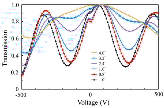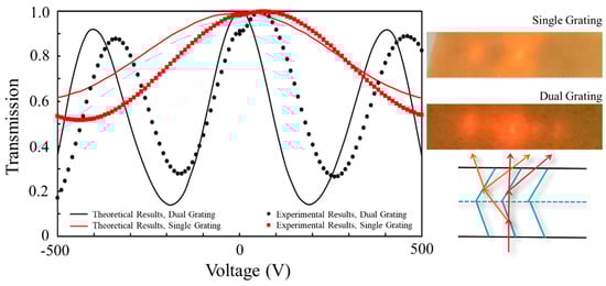 With the 1064 nm incident wave, the Bragg condition for the 20.25- and 20.30-μm grating periods required a ~0.69° incident angle as the Bragg angle. We optimized the incident angle of the incident laser beam so that the Bragg condition is satisfied. If the incident angle differed too much from the Bragg angle, the deflection efficiency would dramatically drop. As the applied voltage ranged from −500 V to + 500 V, we measured the 1064-nm zero-th order transmission of the two EOPBD samples. Figure 4 shows the theoretical and experimental results for the two samples. The beam size in the samples was controlled to be about 100 μm. The theoretical prediction is calculated using Equations (A5) and (A7), respectively for the single-grating and the dual-grating configurations. It is found that the experimental results showed great agreement with the theoretical predictions.