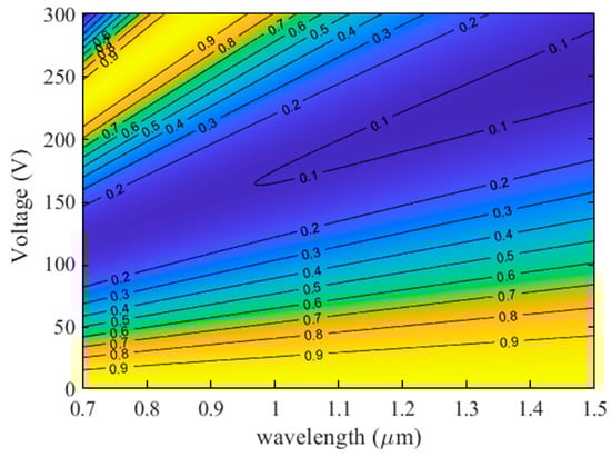Theoretical contour plot of the transmission as a function of wavelengths and applied voltages. It is found that there is a simultaneous broadband and high-deflection efficiency operation region during the 150~200-V region. Dispersion of refractive indices is included in the simulation.