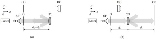 Figure 1a,b schematically represent the measurements for the reflection spherical mirrors and transmission spherical lenses (bi-convex or bi-concave), respectively. To facilitate understanding, an x–y–z coordinate system is introduced in the figures. A collimated and expanded laser beam with a wavelength of λ passes through the Ronchi grating (G), located at (x0, y0); the transmittance of the grating can be written as