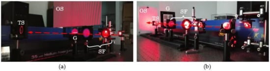 Experiment setup for measuring (a) reflection and (b) transmission samples. SF, spatial light filter; G, Ronchi grating; TS, test sample; OS, observation screen.
