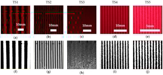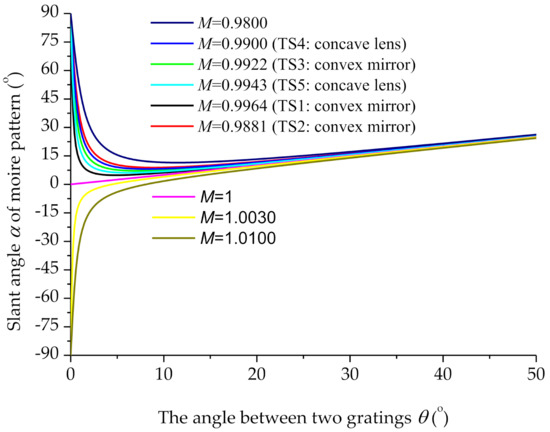 The relationships between the slant angle α of the moiré pattern and the angle θ between the practical and digital gratings were simulated according to Equation (9). These relationships are associated with the value of M (the adapted period ratio for two period patterns), as shown in Figure 5. When M = 1, the relationship between α and θ is linear. In practice, the period of the digital grating typically is slightly different from that of the captured pattern. Bending curves are generated, which gradually deviate from the linear (M = 1) according to the deviation of the value of M from 1. When M < 1, the curves lie above the linear line. By contrast, when M > 1, the curves lie below the linear line. The values of M for TS1–TS5 were 0.9964, 0.9881, 0.9922, 0.9900, and 0.9943, respectively (Figure 5). The value of the slant angle α varies significantly with small variations in the angle θ when θ < 2.5°. By contrast, α has a gentle slope when θ > 10°. In addition, a large value of α, approaching 90° (with a small angle θ), should be avoided to avert an extreme value of the tangent function of α in Equations (10)–(12). Therefore, the ideal angle θ was set as 30°, as illustrated in Figure 5 and Table 1.