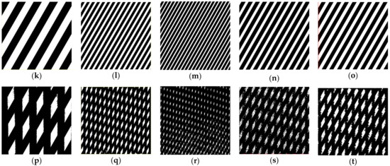 The captured intensity with a period of mp1 and a grating vector K1 = (2π/mp1) is superimposed on a digital grating with a period of p2 and a grating vector K2 = (2π cosθ/p2)−(2π sinθ/p2), as shown in Figure 2. The value of p2 is determined by the captured pattern described in Equation (8) and is set as p2 ≅ mp1. Therefore, a moiré pattern with a slant angle α can be obtained. The slant angle α is defined as the angle between the grating vector K3 of moiré pattern and the y-axis which can be written as [14]