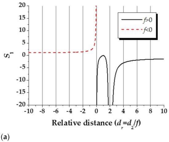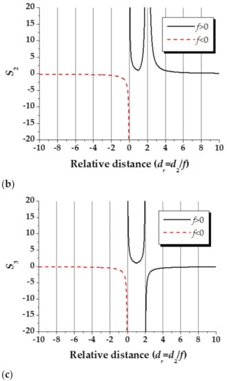 where dr is defined as relative distance which equals d2/f. In Equations (21)–(25) (with and ) it is obvious that smaller absolute values of S1, S2, and S3 ensure relatively small introduced errors which are directly related to the relative distance in Equations (26)–(28). Therefore, the relationships between S1, S2, and S3 to the relative distance dr are plotted in Figure 8a–c. The simulation results reveal that a smaller measurement uncertainty can be achieved with increasing the distance of d2 for cases of f > 0 and f < 0. In the case of f > 0, a smaller measurement uncertainty can also be obtained when d2 is near the focal length; meanwhile, the distance of d2 = 2f must be avoided. In addition, from Equations (21) and (22), properly increasing the period p1 of the grating can also reduce the measurement uncertainty. Because a small measurement uncertainty ultimately relies on a high-precision control of experimental conditions. Considering errors of Δp1 = 0.001 mm, Δp2 = 0.01 mm, Δd2 = 0.01 mm, Δα = Δθ = 0.01° under accurate controls, theoretical evaluations for the measurement uncertainty of focal length under different focal lengths, relative distances, and periods of grating are summarized in Table A1, in Appendix A. Accordingly, this method could be applied to regular commercial spherical lenses and mirrors (−200 mm< f < +200 mm) with Δf < 1.6 mm within a measurement distance of 2 m. Considering the limited length of optical benches, there must be a trade-off between measurement resolution and measurement distance. In addition, distortion of the grid image may occur on the observation screen during measurement which is a function of the off-axis image distance. Therefore, it is necessary to capture the image of the paraxial area to avoid introducing additional errors on the moiré fringes.
