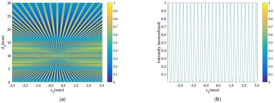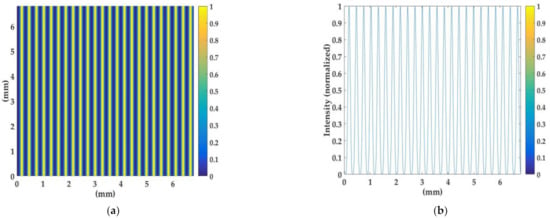 Simulated (a) intensities behind the grating (with a period of p1 = 0.2822 mm) and (b) the intensity profile.