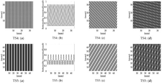 The intensity behind the grating (with a period p1 = 0.2822 mm) and its intensity profile were simulated according to Equation (2), as shown in Figure 9. The intensities on the observation screen, and their intensity profiles, the corresponding digital grating with θ = 30°, and their moiré pattern for TS1–5 were simulated (p1 = 0.2822 mm, d1 = d2 = 251.7 mm, and θ = 30°) according to Equation (8), as shown in Figure 10. The simulation results corresponded suitably with the experimental results shown in Figure 4, thus confirming the correctness of the derived equations.