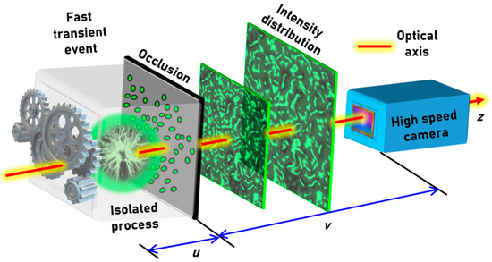 The optical configuration of light collection from an isolated fast transient industrial process through an occlusion (metal window with holes) by a ultra-high-speed camera is shown in Figure 1. Many industrial processes produce intense temperature, light intensity, and pressure so are generally isolated from their surroundings. This makes it difficult to image or monitor using conventional lens-based imaging systems. A metal occlusion consisting of few holes is better than a glass window as it can substantially cut down the light intensity. Additionally, an electrical bias of such “metallic-optics” can be used to mitigate material (re)deposition for a close placement of them near high-temperature event. Furthermore, if the holes have sizes of the order of the wavelength of interest then the light will undergo diffraction and generate intensities within recordable range of values. Let us consider that the fast transient event generates light that is spatially as well as temporally incoherent (Figure 1).
