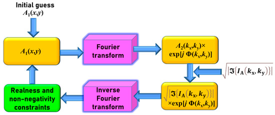 The block diagram for the phase-retrieval algorithm is shown in Figure 2. In the first step, the autocorrelation of the object intensity distribution is calculated, followed by a Fourier transform and square root operation yielding the magnitude of the Fourier transform of the object. There are two planes of interest with complex amplitudes A1(x, y) and exp[jΦ(kx, ky)] as shown in Figure 2. The size of A1(x, y) is predicted as approximately half of the extend of IA as the autocorrelation of the intensity is equivalent to the autocorrelation of the object if the autocorrelation of the PSF generates a Delta-like function. The algorithm begins with an initial guess object function A1(x, y) with a size about half of the width of IA and a value of zero for all other pixels of the matrix. This matrix is Fourier transformed and the resulting complex amplitude’s real part is replaced by while the phase Φ(kx, ky) was carried on. The resulting matrix is inverse Fourier transformed and the constraints of non-negativity and real are applied and this process is iterated until the matrix A1(x, y) converges and reaches non-changing values. Thus, the object function is reconstructed. Previous studies have indicated that convergence of the algorithm is highly dependent upon the initial guess matrices and so it was repeated many numbers of times with different initial guess matrices mostly with a random profile [6].