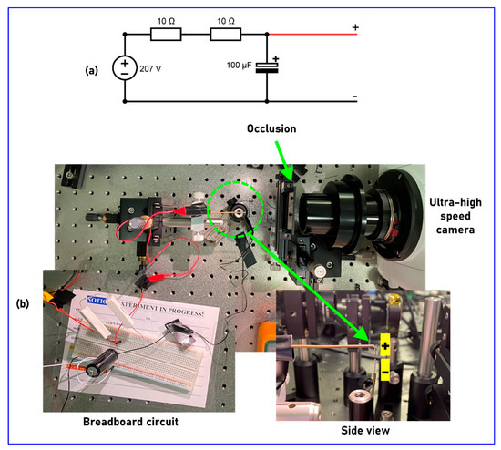 (a) Circuit diagram for generating a spark. (b) Photograph of the experimental set up. A spark event was generated using (a) at a distance of 5 cm from the occlusion and an ultra-high-speed camera was mounted at a distance of 15 cm from the occlusion.