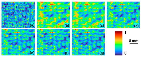 Experimentally recorded green PSF (a), object intensity distributions at t = 0 μs (b), 40 μs (c), 80 μs (d), 120 μs (e), 160 μs (f) and 200 μs (g).