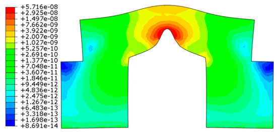 As shown in Figure 2, most of the elastic strain energy for the cubic optical cavity is concentrated in the mirror substrate, similar to the cylindrical and spindle cavity case [16,17,23]. The deformation shape of the substrate reflects the Gaussian beam profile. For illustration purposes, a beam waist of 2 mm has been chosen. For the cubic spacer, the maximum elastic strain energy occurs around the central bore near the contact area with the mirrors. Strong local deformations occur at the boundary between substrate and spacer extending into the spacer. At a distance exceeding this critical depth, a homogeneous energy density distribution is obtained. According to Equation (2) in Ref. [16], the analytic estimate of the spacer contribution does not hold for the full spacer length as it neglects local deformations arising from the non-uniform pressure distribution on its front face.