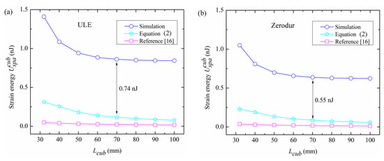 Strain energy as a function of edge Lcub of the cubic spacer. The solid blue line with circles represents the simulation results. Magenta solid line with squares presents the analytic estimate according to Equation (2) in Ref. [16]. Cyan solid line with stars presents the analytic estimate according to Equation (2). (a) ULE cubic spacer with ULE substrates. (b) Zerodur cubic spacer with Zerodur substrates.