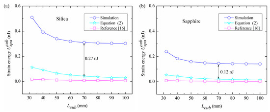 Strain energy as a function of edge Lcub of the cubic spacer. The solid blue line with circles presents the simulation results. Magenta solid line with squares presents the analytic estimate according to Equation (2) in Ref. [16]. Cyan solid line with stars presents the analytic estimate according to Equation (2). (a) Silica cubic spacer with silica substrates. (b) Sapphire cubic spacer with sapphire substrates.