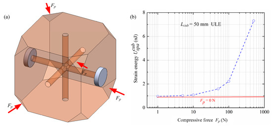 To rigidly mount the cubic optical cavity, four Fps were used to load the cut faces of the cubic cavity. Fp will change the stress field inside the cubic optical cavity, affecting the strain energy contributed from the force F in Equation (1). Assuming that the strain energy produced by four Fps where F = 0 N is defined as Up, and the strain energy produced by four Fps and F = 1 N is Up+F, then the strain energy contributed from the force F = 1 N can be expressed as