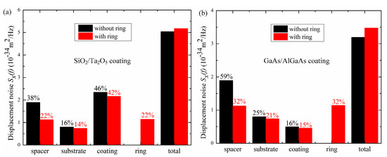 Figure 6 shows the FEA results of the Sx(f) contributions caused by the different cavity components. We find that the additional Sx(f) of the ULE ring is approximately equal to that of the spacer. Neither can be neglected. Using a GaAs/AlGaAs crystalline coating, the Sx(f) contribution in a spacer for an optical cavity with and without ULE rings is about 59% and 32%, respectively, corresponding to the contribution of thermal noise in a spacer to the total thermal noise. The ULE ring noise contributions are much higher than that of the coating thermal noise. However, when using a SiO2/Ta2O5 coating, the main contribution of Sx(f) in the optical cavity comes from the spacer and coating, and Sx(f) in the spacer accounts for 38% of the total Sx(f) for the optical cavity without a ULE ring, corresponding to the proportion of spacer thermal noise in total thermal noise. We have the paradoxical situation that a mixed material cavity with additional rings shows more thermal noise than one without these rings, which is different from a cylindrical optical cavity. The main reason may be attributed to Fp resulting in a change in the internal stress in the optical cavity.