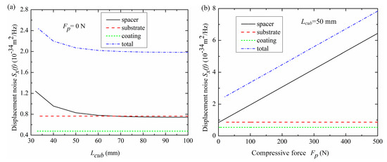 In mixed material cavities with FS substrates and an AlGaAs crystalline coating, the ULE spacer limits performance of the cubic optical cavity. Contributions to the thermal noise from the optical length Sx(f) as functions of the spacer length Lcub and Fp are shown in Figure 7. Under the condition of Fp = 0 N, when the spacer length Lcub is greater than 60 mm, the contribution of Sx(f) from the spacer equals that of the substrates. The total Sx(f) in the cubic optical cavity tends to a constant. As shown in Figure 7b, Sx(f) in the cubic cavity is proportional to Fp. For a 50 mm long ULE cubic optical cavity, when Fp is greater than 100 N, the displacement noise contributed from every 100 N Fp is about three times that of FS substrates and the GaAs/AlGaAs crystalline coating, corresponding to the contribution to the thermal noise by Fp.