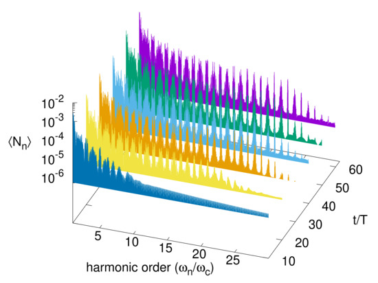 As we can see, the populations of the HH modes build up gradually as the amplitude of the excitation increases. Initially, when the amplitude of the exciting field is considerably lower than its maximal value, modes with lower frequencies become populated. After the maximum of the envelope function, the range of the populated modes practically does not change. When the excitation is over, the photon number expectation values plotted versus the mode frequency resemble experimental HHG power spectra: we can see the well-defined peaks at integer multiples of a plateau region and also the high-frequency cutoff. The internal structure of the peaks—specifically the observable difference between peaks corresponding to odd and even order harmonics—can be explained, e.g., using a Floquet analysis of the problem [17]. This is, however, specific to the case of two-level atoms, not expected to be directly applicable to more complex material systems. (For example, for atomic gases—as well as for solids with inversion symmetry—HHG spectra are dominated by odd-order peaks, which is a consequence of the spacetime symmetry of the joint matter-excitation system [18,19,20]. For two-level systems, HH peaks also appear at even multiples of the exciting frequency.)