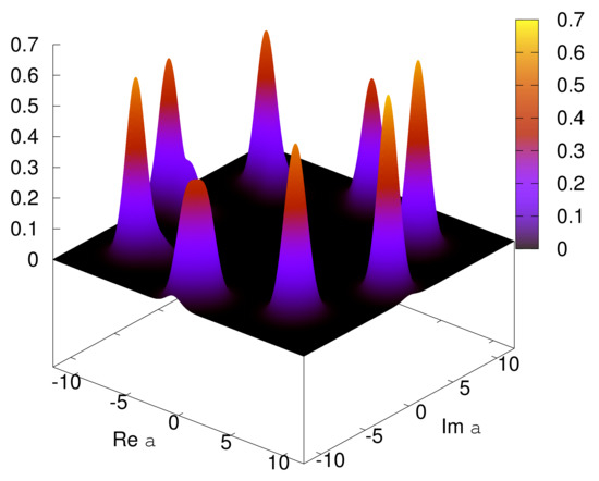It can be shown that the complete (infinite) von Neumann lattice is not needed to perform precise numerical calculations [27]. By choosing a very limited subset of the lattice around the initial coherent state ( points), and rotating it as it is shown by Equation (12), during the time scale of the HHG process, the action of will not drive the state of the system outside the subspace spanned by the rotating members of the basis. That is, although the non-orthogonality of the von Neumann lattice states introduces a certain inconvenience, it is a low price to pay for obtaining a small, numerically invariant subspace. Using this approach, quasi-probability distribution functions [28,29,30,31] can also be calculated in order to describe the quantum state of light in the phase space of the mode [32].