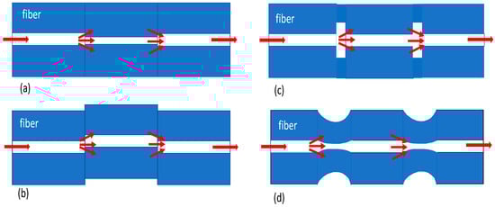 Figure 3 presents typical configurations of a FOMI. Figure 3a presents a FOMI comprised of two segments of fibers with different core diameters [,], while in Figure 3b, the pieces of the same fiber are offset [,]. Finally, in Figure 3c, a taper segment is sandwiched between two pieces of single-mode fibers (SMFs) [,]. The second piece of fiber, in all cases, has a reflector at its end. The effective refractive index difference between the core mode and dominant high-order cladding modes gives rise to the phase difference.