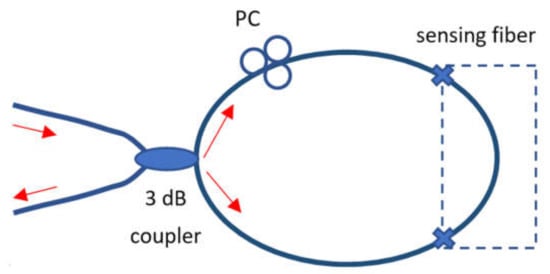 The fiber-optic Sagnac interferometer (FOSI) is a very simple structure consisting of a loop of fibers along which two beams travel in opposite directions with different polarization states. A FOSI is very attractive due to its insensitivity to the environment. A schematic in Figure 4 presents the incoming beam, which is split by a 3 dB coupler, and the two beams propagate in the fiber loop in counter-directions (clockwise and counterclockwise) recombined on the same coupler after a complete loop in the fiber. The optical path difference is defined by the polarization-dependent propagating speed of the mode guided along the loop. The state of polarization is controlled by a polarization controller (PC), and to maximize the polarization dependency of the interferometer, the sensing part of the FOSI is usually a specialty fabricated fiber, i.e., a highly birefringent fiber, polarization maintaining fiber, [,,], etc.