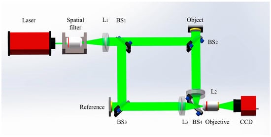 In this paper, we introduce a new type of large-field microscopic speckle interferometry system. The optical path diagram of the system is shown in Figure 2. In the process of measurement, the laser beam is expanded by the spatial filter and converted into parallel light by the first doublet lens L1. Then, it is split into the measurement beam and reference beam by beam splitter (BS) BS1. The measurement beam illuminates the measured object through BS2, and then reflects back to BS2, and converges into the field of view of microscope objective through doublet lens L2 and BS4. In the experiment, considering that the light is scattered on the rough surface of the measured object, the reflected light intensity gradually weakens as the distance increases, so the distance between BS2 and L2 needs to be as small as possible to ensure sufficient light intensity converges into L2. Therefore, the lens is placed in front of the BS3. Similarly, the reference beam illuminates the reference object through the BS3, and finally converges into the field of view of the microscope objective through doublet lens L3 and BS4. Two beams converge and interfere in front of the microscope objective, and the time-series interferograms amplified by the microscope objective are collected by CCD.