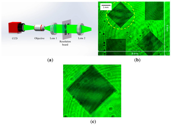 Figure 5. (a) Schematic diagram of imaging by CCD, objective and the doublet lens group; (b) the captured image corresponds to the blue contour region in Figure 3c; (c) the enlarged image of the yellow contour region.