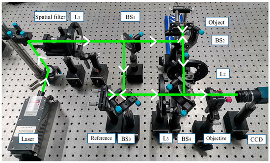 The traditional Mach–Zehnder uses two mirrors, and the utilization rate of light is really high. Considering that the measured object is not transparent, we use two beam splitters to replace the two mirrors in our optical path, resulting in only half of the light entering the transmission optical path. However, this phenomenon has little effect, for the current laser power is very high. As in our experiment, the CCD exposure time is only 200 microseconds, and a clear and bright interferogram can be observed.