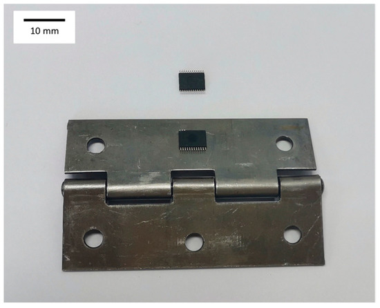 The measured object and reference object in the experiment are microchips with the size of 5 mm × 6 mm × 1 mm (W × L × H), as shown in Figure 7. We need to measure the displacement of the whole microchip. Because the microchip is similar to a rigid body, it is difficult to generate deformation by heating or loading force. The method we adopt here is to place the measured object on the hinge, the hinge axis is fixed, and the blade is pushed by the Physik Instrumente (PI) displacement platform to simulate the displacement of the measured object. The accuracy of the PI displacement platform is 10 nm. The specific process is shown in Figure 8.