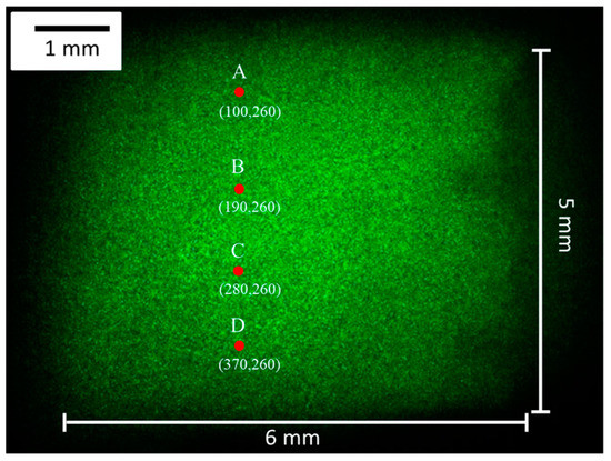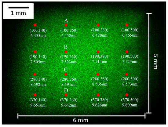 In order to verify the full-field performance of the system and the measurement accuracy of different positions, 16 arbitrary pixels were selected to display their displacement values, as shown in Figure 14. Among them, 12 points are in the same row with points A, B, C, D, respectively. According to the displacement direction, the displacement values of these pixels in the same row should be the same. The measuring result is shown in Figure 14, and the maximum relative error of the 12 points is 0.46%. After traversing all the pixels that record the interference information, the full-field displacement map of the object can be obtained. After calculating the displacement values of all pixels and removing individual dead pixels through smoothing operations, the overall displacement map can be obtained, as shown in Figure 15. In our research, we use MATLAB to calculate the displacement information of each pixel and finally realize the full-field measurement. The entire processing process takes less than 15 s.