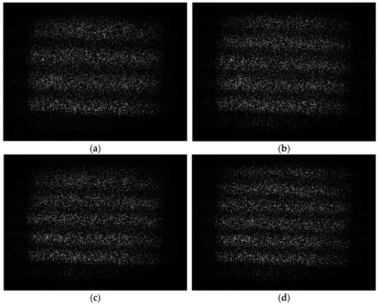 The interference fringe pattern obtained by the subtraction mode. (a–d) represent the 70th, 140th, 210th, and 280th speckle interferogram subtracting the first one, respectively.