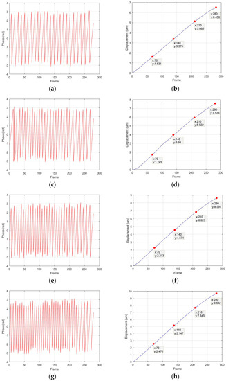 Then, the linear relationship of four points is used in further judgment. Because the four points are selected with an equal pixel interval, and the measured object is approximate to the rigid body and will not deform easily, so the four points should have a linear correlation. The final displacement values of the four points are connected and the correlation coefficient R2 is calculated to be 0.9994, as shown in Figure 13, which indicates that the linearity is very good. That is, our experimental results have high accuracy.
