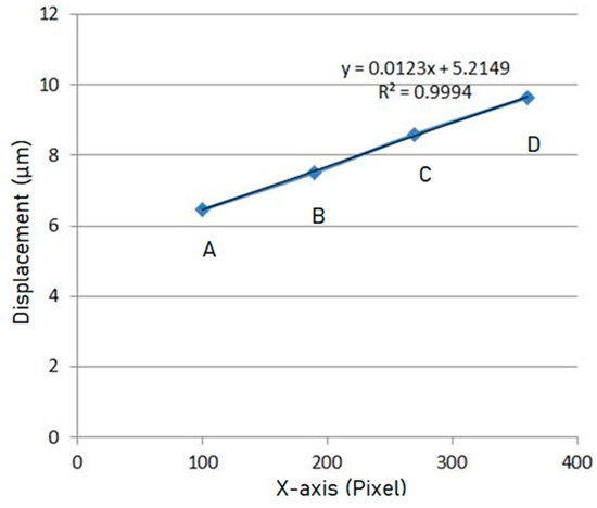 It should be noted here that when imaging with a doublet lens group, the object and the image are in opposite directions. Therefore, the smaller the x coordinate of the pixel, the closer to the fixed axis of the hinge it is, and the displacement value of the four pixels gradually becomes smaller. The final displacement range calculated from the experimental results is 5.75–10.47 µm, which, respectively, corresponds to the displacement value of the low end and the top end of the microchip.