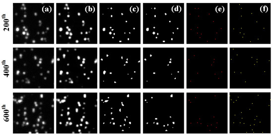 The 200th, 400th, 600th frames of long sequence Tubulins. (a) the original frames; (b–e) the frames after blind deconvolution, grayscale binarization transformation, removal operation, and centroid localization, sequentially; (f) the frames simply resulted from centroid localization. Image size: 6.4 μm × 6.4 μm.