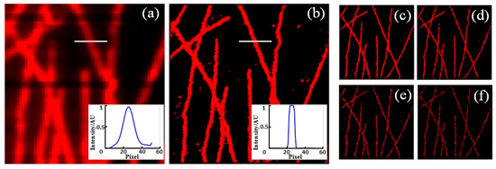 Then, using the BDCL-SMLA method, we obtain the reconstructed image of long sequence Tubulins of 15,000 frames with image size of 6.4 μm × 6.4 μm as shown in Figure 3b, comparing to the original image in Figure 3a. The inset pictures display the lateral profiles along the lines at same position. The reconstruction process needs 505 s. Moreover, we obtain the images reconstructed from the original 15,000 frames at intervals of 5, 10, 20 and 30 frames, as shown in Figure 3c–f, which take 115 s, 65 s, 37 s and 25 s, respectively. With the decrease in the frames, the reconstruction speed improves, while low image contrast and artificial disappearances of some structures are observed. From our calculation, 750 frames (at interval of 20 frames) or more are necessary for reconstruction to ensure the image quality.