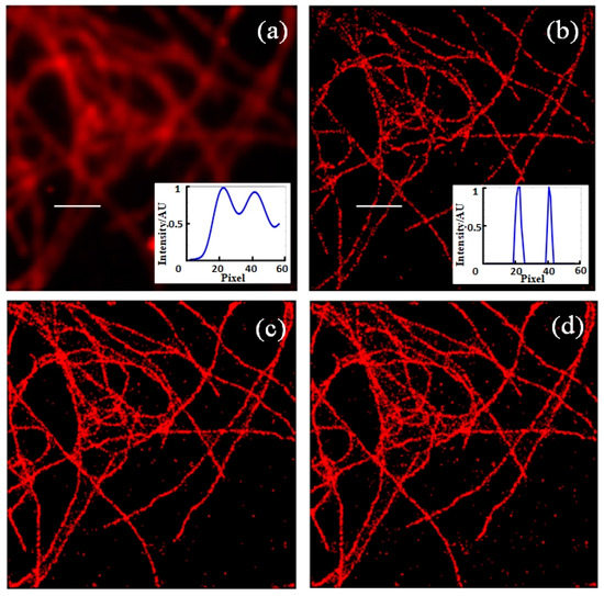 - Cheng, T.; Chen, D.; Yu, B.; Niu, H. Reconstruction of super-resolution STORM images using compressed sensing based on low-resolution raw images and interpolation. Biomed. Opt. Express 2017, 8, 2445–2457. [Google Scholar] [CrossRef] [PubMed] [Green Version]