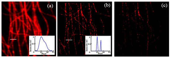 The original image (a) and reconstructed image with BDCL-SMLA method (b) of high-density Tubulins, with the lateral profiles along the lines shown in inset pictures; (c) the reconstructed image obtained only through the centroid localization. Image size: 6.4 μm × 6.4 μm.