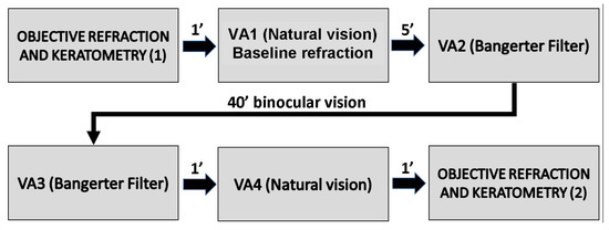 After VA2 was estimated, the subjects could move freely and leave the room for 40 minutes, always wearing the BF under binocular vision. No other instructions or restrictions were given. Once this break was over, the VA was measured again (VA3). Immediately after the retrieval of VA3, the BFs were removed, and a final VA estimation (VA4) was obtained. More specifically, VA4 was performed under identical optical conditions as VA1. For the sake of clarity, a schematic diagram of the protocol is shown in Figure 1.