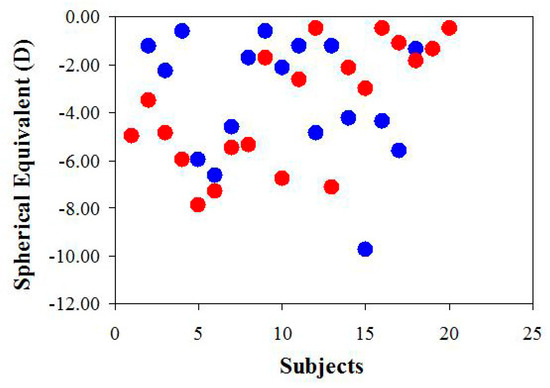 Values of spherical equivalent refractive errors for all participants (randomly numbered) involved in this study. Blue and red symbols represent control and BF subjects, respectively.