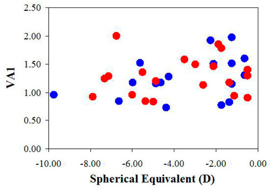 The values of VA1 for the two groups of subjects as a function of the spherical equivalent are shown in Figure 3. These VAs correspond to the basal measurements and serve as a reference for changes as a function of time during the experiment. VA1 values were in the range between 0.73 and 2.00 in decimal scale, and no statistically significant differences were found between the two groups of subjects (t-test, p = 0.94). Moreover, the highest fraction of VA1 values (73%) corresponded to the interval [0.9, 1.5], which is associated with normal vision. The Shapiro–Wilk test indicated a normal distribution for VA1 (W = 0.93; p = 0.19).