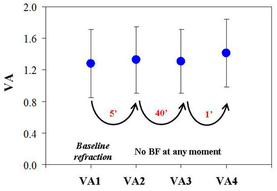 In Figure 9, all the VA values for the different experimental conditions for the BFG are shown. Results show noticeable and statistically significant variations in VA. VA suffers a significant (and immediate) reduction when the filter was applied (i.e., VA2 vs. VA1; see also Figure 6). After wearing the BF for 40 minutes, the VA exhibited a moderate increase of ~15% (VA3 vs. VA2 comparison), which was found to be significant (p = 0.02; see above). Finally, when the BF was removed, the VA values (VA4) presented similar values (no significant differences, p = 0.32) to those measured at the beginning of the experiment (basal values, VA1).