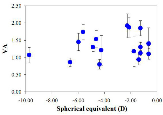 After 40 minutes of wearing the BF, the VA was determined again (VA3). Figure 7 presents the VA3 values as a function of the VA2 values. The plot shows the changes in VA as a result of wearing the BF. A statistically significant linear relationship was found (R = 0.60, p = 0.002). VA2 and VA3 presented normal distributions, as measured with the Shapiro–Wilk test (W = 1; p = 0.9 for both of them). On average, VAs increased from VA2 = 0.54 ± 0.18 to VA3 = 0.63 ± 0.18. When the paired t-test was used, these two VA sets showed statistically significant differences (p = 0.02). This might suggest a visual adaptation phenomenon to the scattering induced with BF. This increase in VA after wearing the BF was not correlated with the spherical equivalent (R = 0.21, p = 0.38).